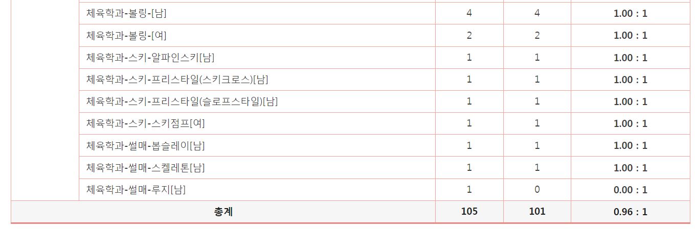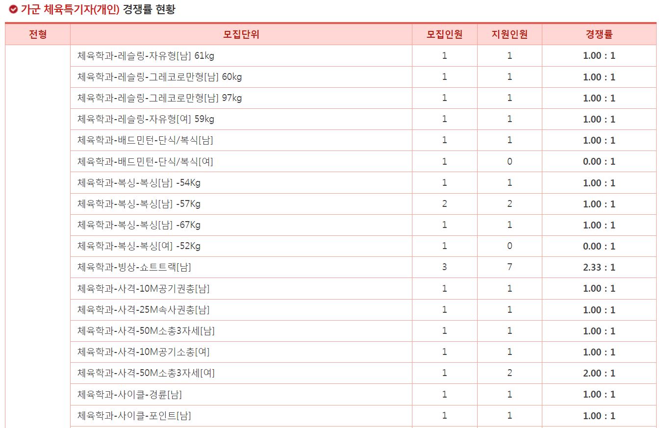 가군 체육특기자(개인)의 체육학과-배드민턴-단식/복식[여], 체육학과-복싱-복싱[여]-52kg, 체육학과-양궁-리커브[여], 체육학과-역도-역도[여] +87kg, 체육학과-유도-유도[남]-73kg, 체육학과-육상(중장거리)-중장거리(경보제외)[남], 체육학과-육상(도약)-멀리뛰기[남], 체육학과-육상(도약)-7종경기[여], 체육학과-육상(도약)-장대높이뛰기[여], 체육학과-체조-기계체조[남], 체육학과-태권도-태권도[여] L-미들, 체육학과-펜싱-플러레[남], 체육학과-근대5종-근대4종[여], 체육학과-테니스-테니스[남], 체육학과-썰매-루지[남]은 미달이었으며, 체육학과-레슬링-자유형[남] 61kg, 체육학과-레슬링-그레코로만형[남] 60kg, 체육학과-레슬링-그레코로만형[남] 97kg, 체육학과-레슬링-자유형[여] 59kg, 체육학과-배드민턴-단식/복식[남], 체육학과-복싱-복싱[남]-54kg, 체육학과-복싱-복싱[남]-57kg, 체육학과-복싱-복싱[남]-67kg, 체육학과-사격-10M공기권총[남], 체육학과-사격-25M속사권총[남], 체육학과-사격-50M소총3자세[남], 체육학과-사격-10M공기소총[여], 체육학과-사이클-경륜[남], 체육학과-사이클-포인트[남], 체육학과-사이클-포인트[여], 체육학과-양궁-리커브[남], 체육학과-양궁-컴파운드[여], 체육학과-역도-역도[남] +109kg, 체육학과-역도-역도[남] 67kg, 체육학과-역도-역도[남] 73kg, 체육학과-역도-역도[남] 81kg, 체육학과-역도-역도[여] 55kg, 체육학과-역도-역도[여] 59kg, 체육학과-역도-역도[여] 87kg, 체육학과-유도-유도[남]-81kg, 체육학과-유도-유도[여]-52kg, 체육학과-유도-유도[여]-57kg, 체육학과-유도-유도[여]-63kg, 체육학과-유도-유도[여]-70kg, 체육학과-육상(단거리)-110mh[남], 체육학과-육상(단거리)-200m[남], 체육학과-육상(도약)-10종경기[남], 체육학과-육상(투척)-창[남], 체육학과-육상(투척)-포환[남], 체육학과-육상(투척)-원반[여], 체육학과-육상(투척)-포환[여], 체육학과-체조-기계체조[여], 체육학과-태권도-태권도[남] 미들, 체육학과-태권도-태권도[남] 밴텀, 체육학과-태권도-태권도[남] L-미들, 체육학과-태권도-태권도[여] 밴텀, 체육학과-태권도-태권도[여] 핀, 체육학과-태권도-태권도[여] L-헤비, 체육학과-펜싱-에뻬[남], 체육학과-펜싱-플러레[여], 체육학과-펜싱-사브르[남], 체육학과-펜싱-에뻬[여], 체육학과-펜싱-사브르[여], 체육학과-근대5종-근대4종[남], 체육학과-조정-쿼드러플스컬(4X)[남], 체육학과-조정-중량급 더블스컬(2X)[남], 체육학과-조정-경량급 싱글스컬(L1X)[여], 체육학과-카누-스프린트MK-1[남], 체육학과-카누-슬라럼C-1[남], 체육학과-카누-스프린트WC-1[여], 체육학과-테니스-테니스[여], 체육학과-골프-아마추어[여], 체육학과-볼링-[남], 체육학과-볼링-[여], 체육학과-스키-알파인스키[남], 체육학과-스키-프리스타일(스키크로스)[남], 체육학과-스키-프리스타일(슬로프스타일)[남], 체육학과-스키-스키점프[여], 체육학과-썰매-봅슬레이[남], 체육학과-썰매-스켈레톤[남]은 모집인원과 지원인원이 같았습니다,