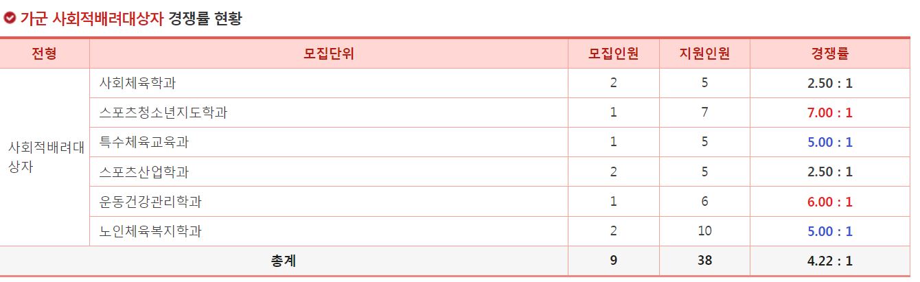 가군 사회적배려대상자에서 가장 경쟁률이 높았던 학과는 스포츠청소년지도학과(7.00:1), 운동건강관리학과(6.00:1), 특수체육교육과(5.00:1), 노인체육복지학과(5.00:1) 순이었습니다.