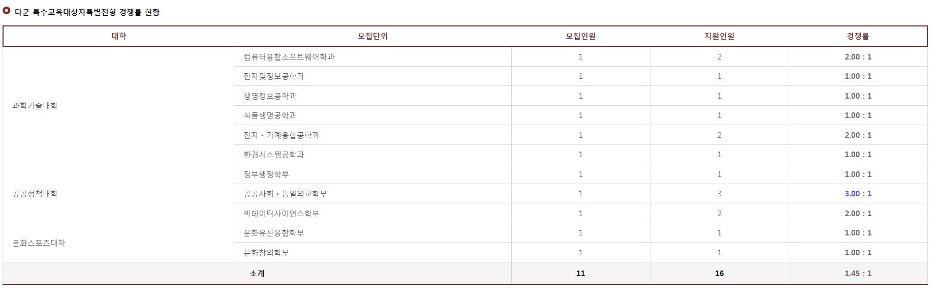 다군 특수교육대상자특별전형에서 전자및정보공학과, 생명정보공학과, 식품생명공학과, 환경시스템공학과, 정부행정학부, 문화유산융합학부, 문화창의학부는 모집인원과 지원인원이 같았으며, 이외의 학과 중 가장 경쟁률이 높았던 학과는 공공사회통일외교학부(3.00:1), 컴퓨터융합소프트웨어학과(2.00:1), 전자기계융합공학과(2.00:1), 빅데이터사이언스학부(2.00:1) 순이었습니다.