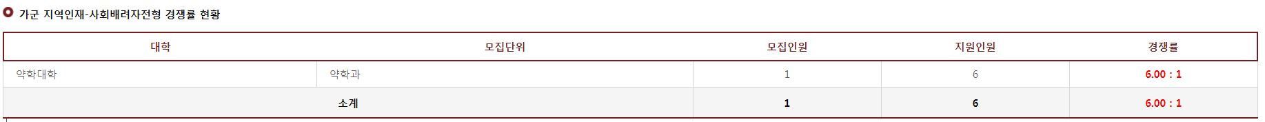 가군 지역인재-사회배려자전형에서는 약학과 학생을 모집했으며, 경쟁률은 6.00:1 이었습니다.