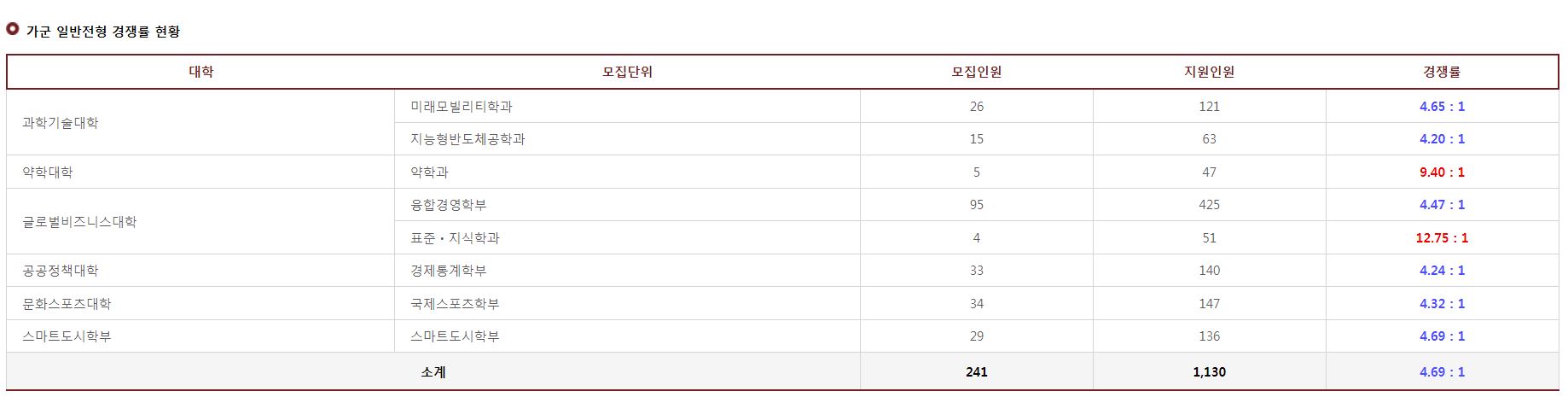 가군 일반전형에서 가장 경쟁률이 높았던 학과는 표준지식학과(12.75:1), 약학과(9.40:1), 스마트도시학부(4.69:1) 순이었습니다.
