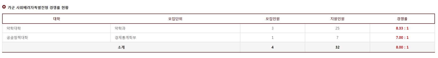 가군 사회배려자특별전형에서는 약학과, 경제통계학부를 모집했으며, 약학과의 경쟁률은 8.33:1, 경제통계학부 7.00:1 이었습니다.