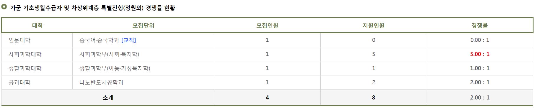 가군 기초생활수급자 및 차상위계층 특별전형(정원외)의 중국어중국학과는 미달이었으며, 생활과학부(아동가정복지학)의 모집인원과 지원인원이 같았습니다. 이외의 학과 중 경쟁률이 높았던 학과는 사회과학부(사회복지학)(5.00:1), 나노반도체공학과(2.00:1) 순이었습니다.