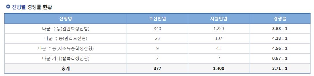 경인교육대학교 나군 기타(탈북학생전형)는 미달이었으며, 일반학생전형의 경쟁률은 3.68:1, 만학도 전형은 4.28:1, 저소득층학생전형은 4.56:1 이었습니다.