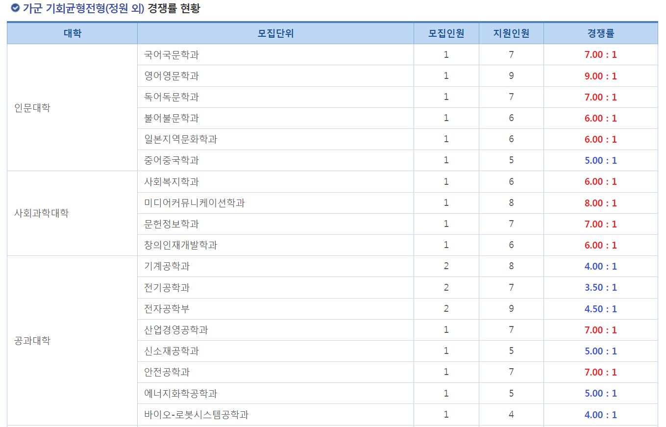 가군 기회균형전형(정원 외) 경쟁률 현황