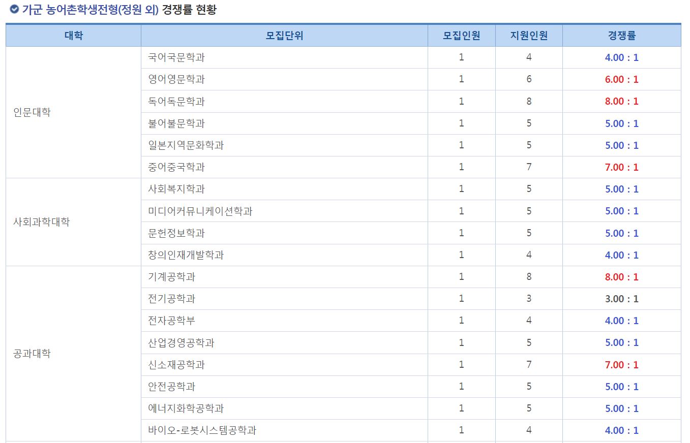 가군 농어촌학생전형(정원 외)에서 가장 경쟁률이 높았던 학과는 일어교육과(15.00:1), 독어독문학과(8.00:1), 중어중문학과(7.00:1), 신소재공학과(7.00:1), 세무회계학과(7.00:1), 생명과학부 생명과학전공(7.00:1) 순이었습니다.