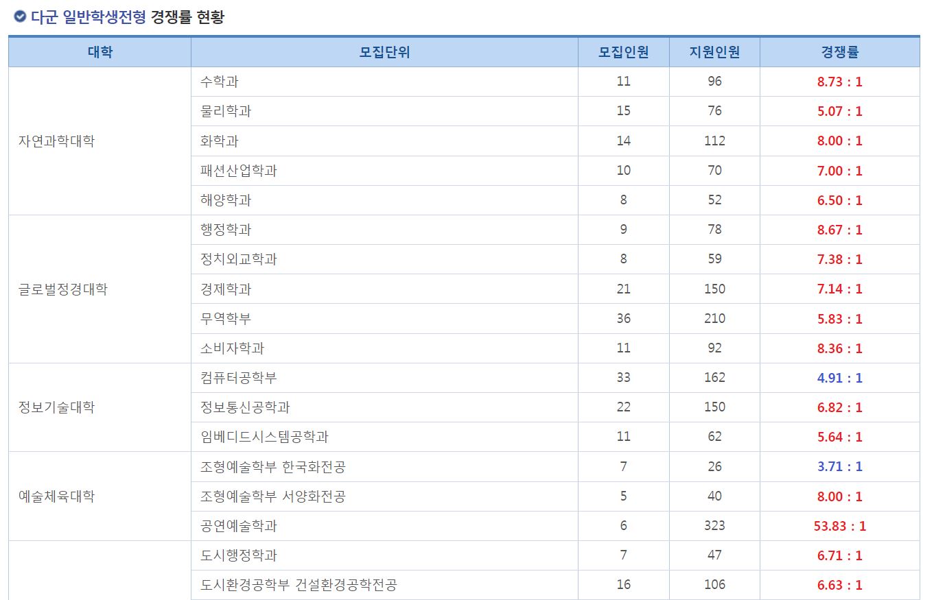 다군 일반학생전형에서 가장 경쟁률이 높았던 학과는 공연예술학과(53.83:1), 수학과(8.73:1), 행정학과(8.67:1) 순이었습니다.