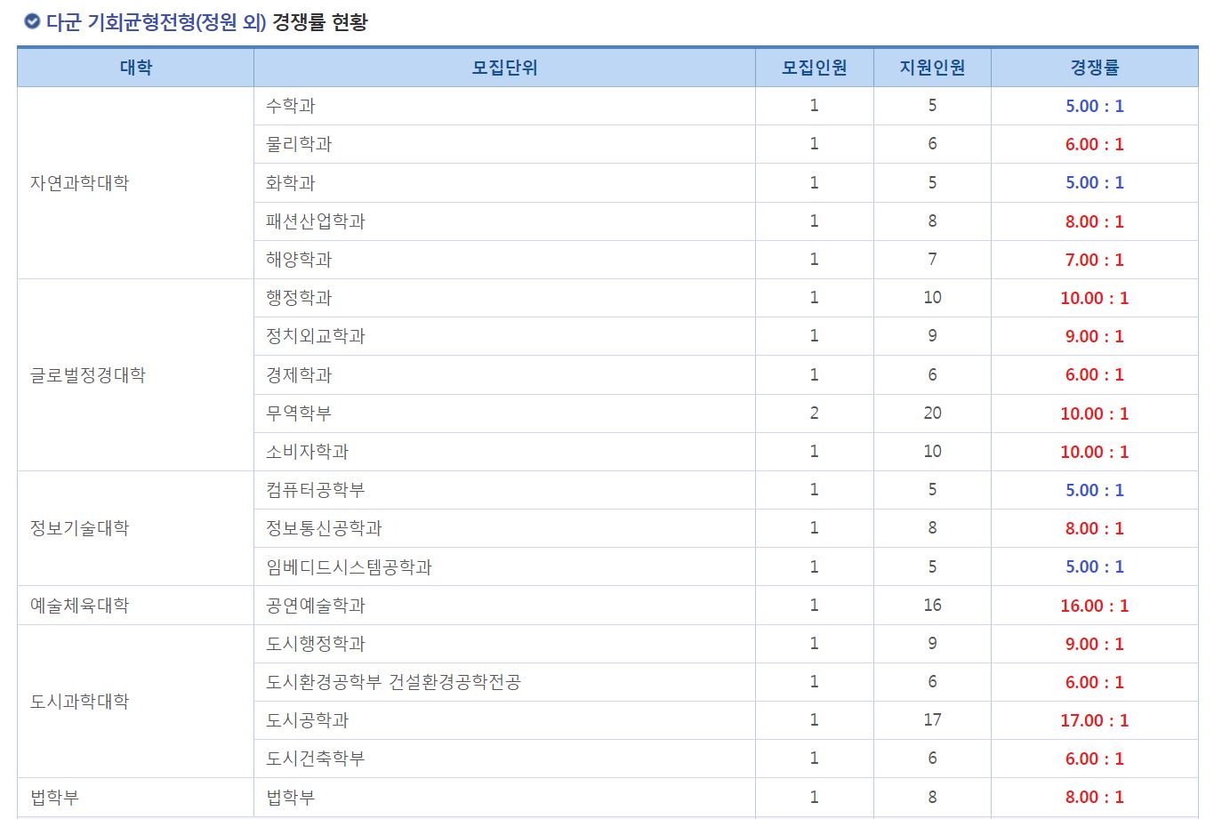 다군 기회균형전형(정원 외) 경쟁률 현황