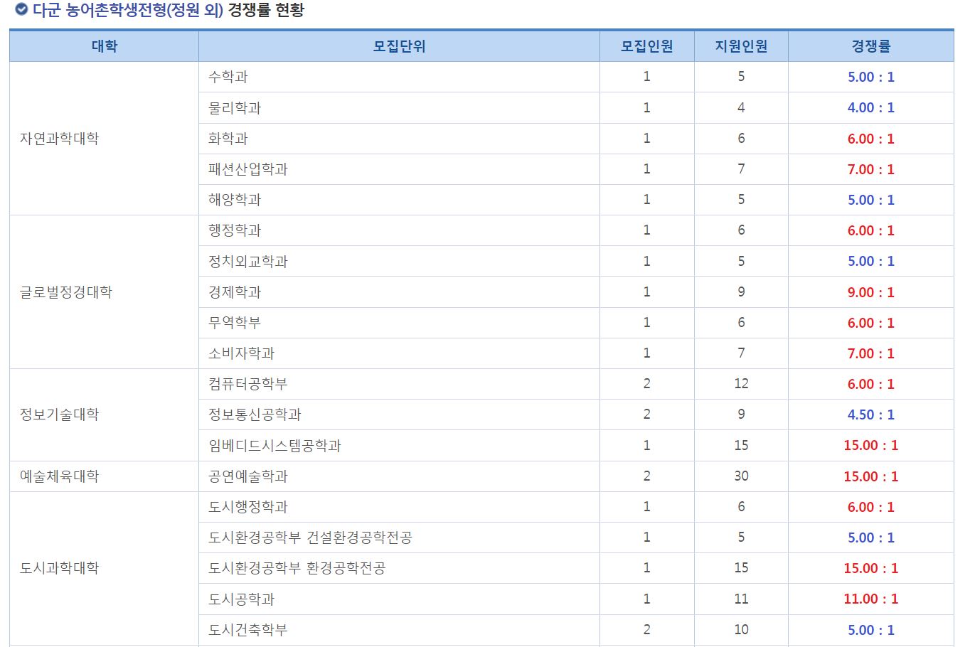 다군 농어촌학생전형(정원 외) 경쟁률 현황