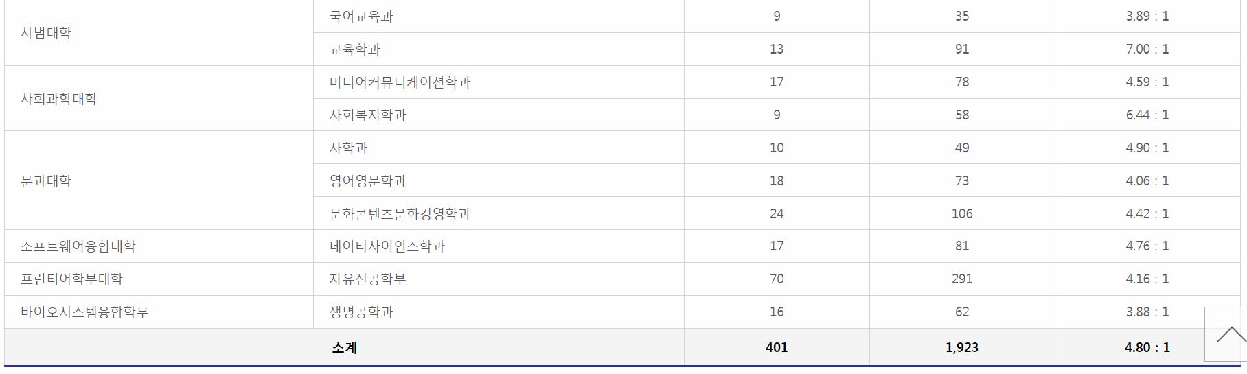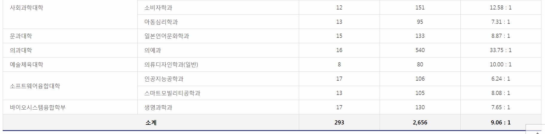 다군 수능(일반)에서 가장 경쟁률이 높았떤 학과는 의예과(33.75:1), 소비자학과(12.58:1), 통계학과(10.73:1) 순이었습니다.