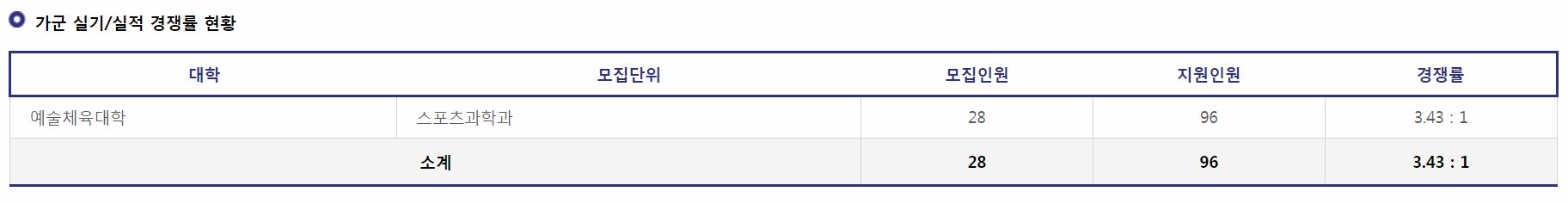 가군 실기/실적에서는 스포츠과학과의 신입생을 모집했으며, 경쟁률은 3.43:1 이었습니다.