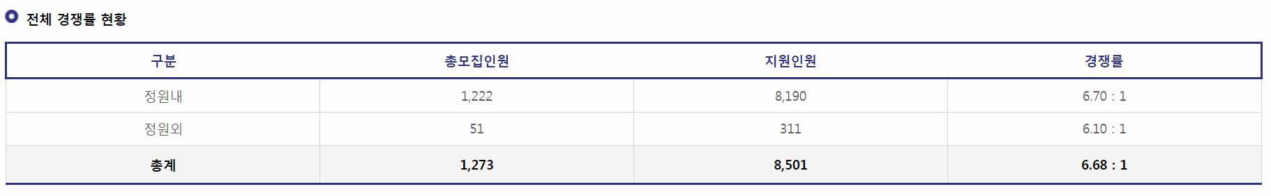 전체 경쟁률 먼저 살펴보도록 하겠습니다. 모든 전형을 통틀어 올해 인하대학교의 정원내 경쟁률은 6.70:1, 정원외 경쟁률은 6.10:1 이었습니다.