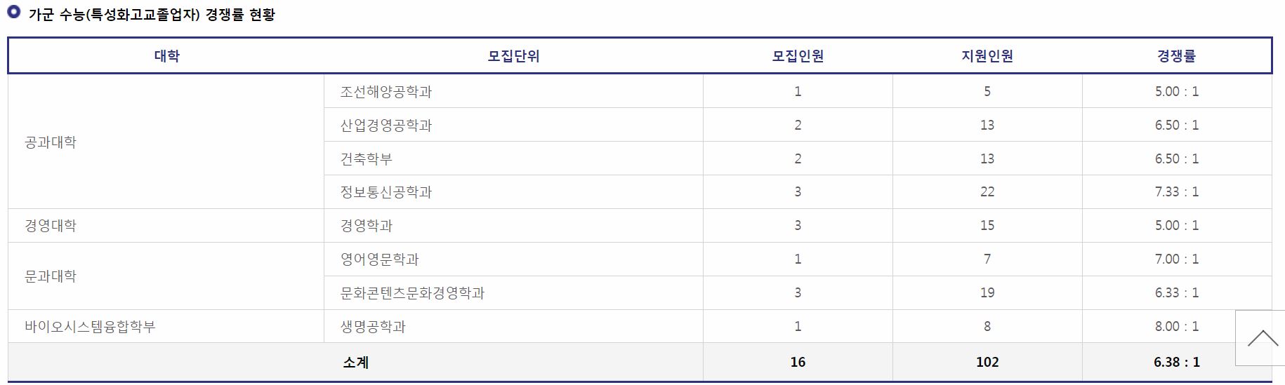 가군 수능(특성화고교졸업자)에서 가장 경쟁률이 높았던 학과는 생명공학과(8.00:1), 정보통신공학과(7.33:1), 영어영문학과(7.00:1) 순이었습니다.