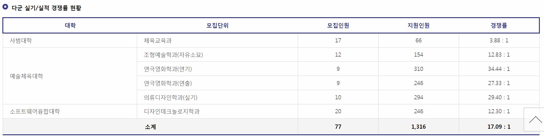 다군 실기/실적에서 가장 경쟁률이 높았던 학과는 연극영화학과(연기)(34.44:1), 의류디자인학과(실기)(29.40:1), 연극영화학과(연출)(27.33:1) 순이었습니다.