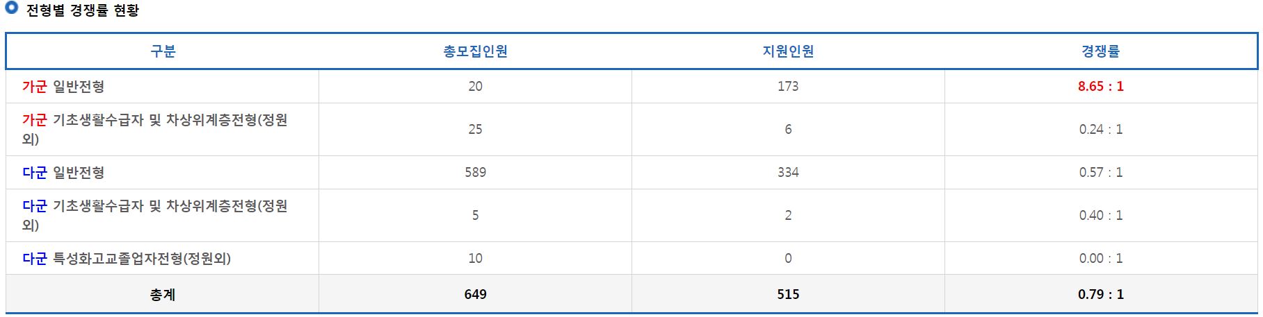 전형별 경쟁률을 살펴보자면, 일반전형을 제외하고 모두 미달이었으며, 일반전형의 경쟁률은 8.65:1 이었습니다.
