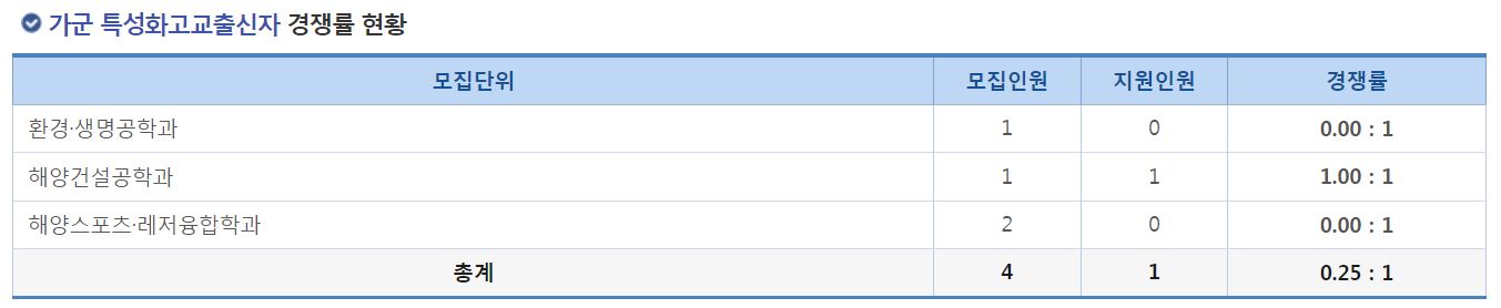 가군 특성화고교출신자 전형에서는 환경생명공학과, 해양건설공학과, 해양스포츠레저융합학과의 신입생을 모집했으며, 환경생명공학과, 해양스포츠레저융합학과은 미달이었으며, 해양건설공학과은 모집인원과 지원인원이 같았습니다.