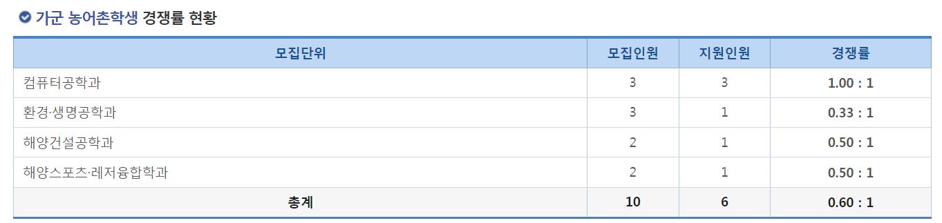 가군 농어촌학생 전형에서는 컴퓨터공학과, 환경생명공학과, 해양건설공학과, 해양스포츠레저융합학과의 신입생을 모집했으며, 환경생명공학과, 해양건설공학과, 해양스포츠레저융합학과는 미달이었으며, 컴퓨터공학과는 모집인원과 지원인원이 같았습니다.