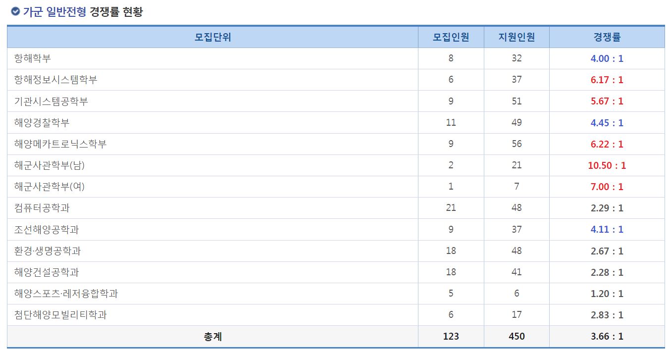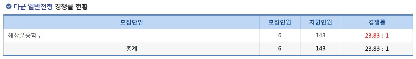 다군 일반전형에서는 해양운송학부의 신입생을 모집했으며, 경쟁률은 23.83:1 이었습니다.