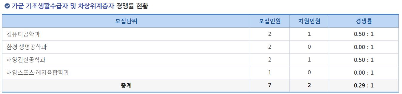 가군 기초생활수급자 및 차상위계층자 전형에서는 컴퓨터공학과, 환경생명공학과, 해양건설공학과, 해양스포츠레저융합학과의 신입생을 모집했으며, 모두 미달이었습니다.