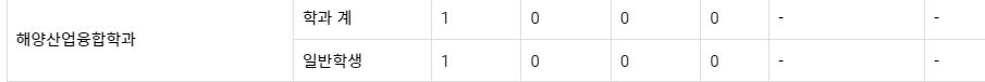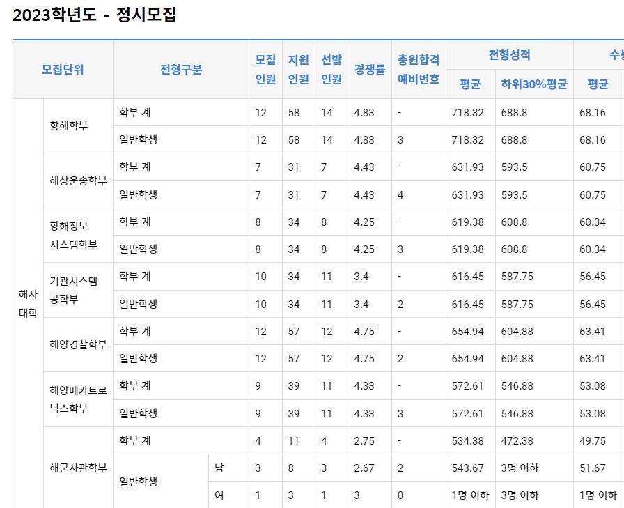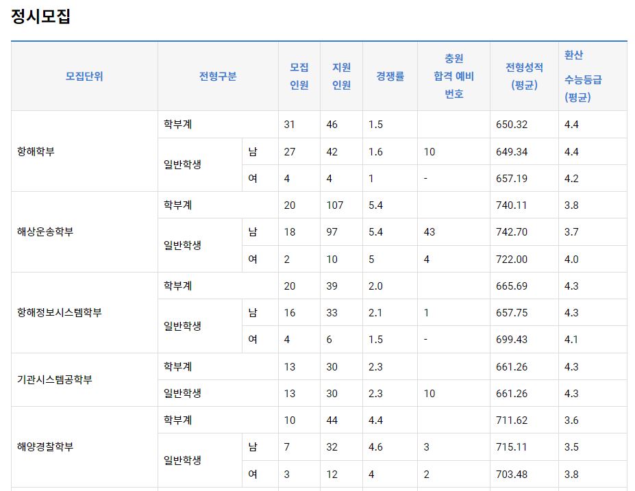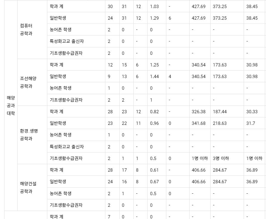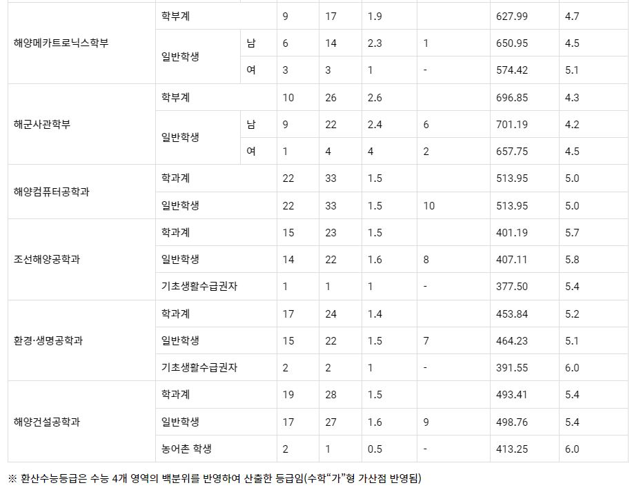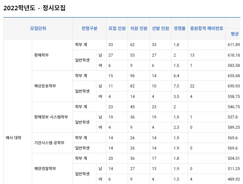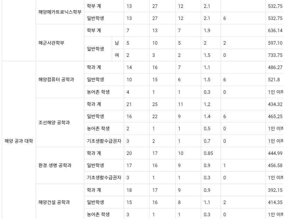 2022학년도 해양컴퓨터공학과(농어촌학생), 조선해양공학과(농어촌학생, 기초생활수급권자), 환경생명공학과, 해양건설공학과(농어촌학생), 해양산업융합학과는 미달이었으며, 이외의 학과 중 가장 경쟁률이 높았던 학과는 해상운송학부(일반학생-남)(7.5:1), 해상운송학부(일반학생-여)(3.5:1), 항해정보시스템학부(일반학생-여)(2.3:1) 순이었습니다.
