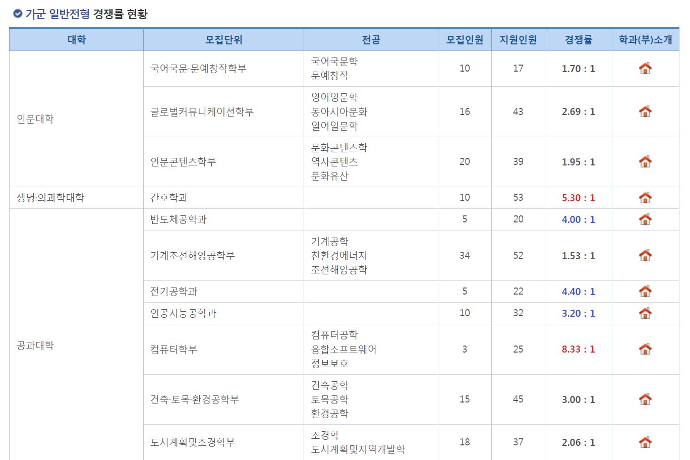 가군 일반전형에서 가장 경쟁률이 높았던 학과는 약학과(11.17:1), 컴퓨터학부(8.33:1), 간호학과(5.30:1) 순이었습니다.