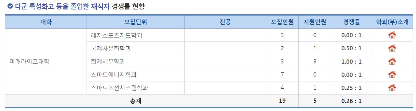 다군 특성화고 등을 졸업한 재직자전형은 회계세무학과를 제외하고 모두 미달이었으며, 회계세무학과는 모집인원과 지원인원이 같았습니다.