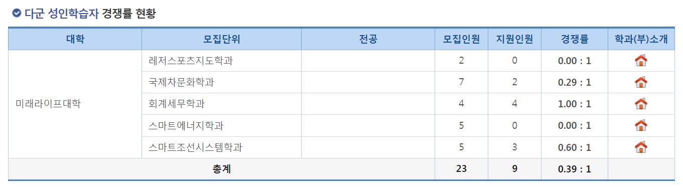 다군 성인학습자 전형 역시 회계세무학과를 제외하고 모두 미달이었으며, 회계세무학과의 모집인원과 지원인원은 같았습니다.