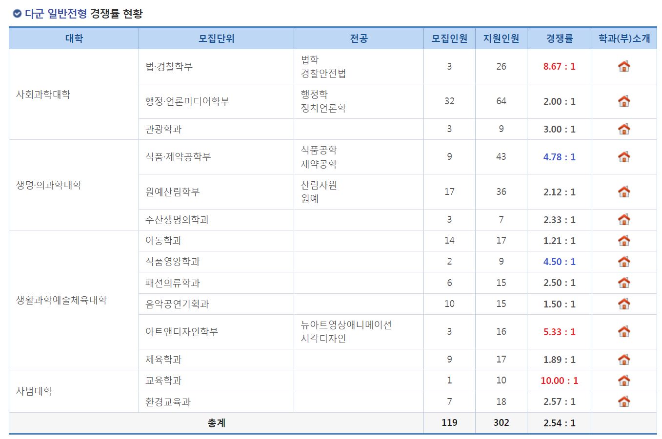 다군 일반전형에서 가장 경쟁률이 높았던 학과는 교육학과(10.00:1), 법경찰학부(8.67:1), 아트앤디자인학부(5.33:1) 순이었습니다.