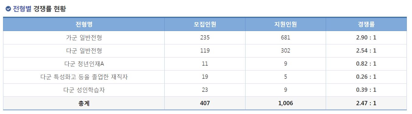 전형별 경쟁률 현황을 살펴보자면, 다군 청년인재A, 다군 특성화고 등을 졸업한 재직자, 다군 성인학습자 전형은 미달이었으며, 가군 일반전형의 경쟁률은 2.90:1, 다군 일반전형은 2.54:1 이었습니다.
