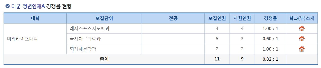다군 청년인재A 전형에서는 레저스포츠지도학과, 국제차문화학과, 회계세무학과의 신입생을 모집했으며, 국제차문화학과는 미달이었으며, 레저스포츠지도학과, 회계세무학과는 모집인원과 지원인원이 같았습니다.
