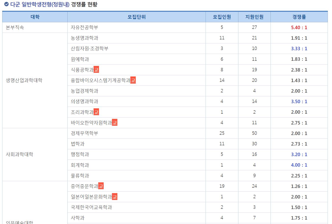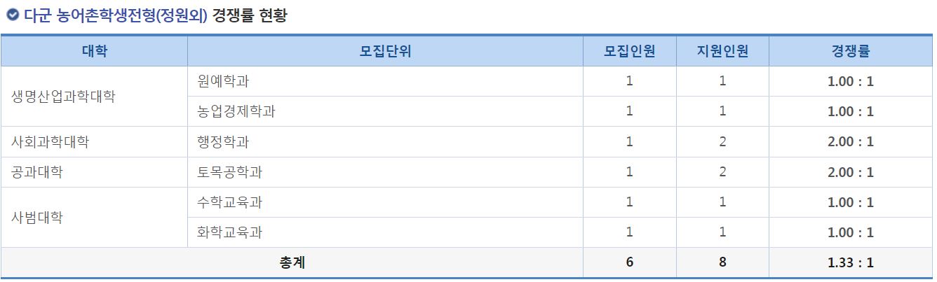 다군 농어촌학생전형(정원외)의 원예학과, 농업경제학과, 수학교육과, 화학교육과는 모집인원과 지원인원이 같았으며, 행정학과, 토목공학과의 경쟁률은 2.00:1 이었습니다.