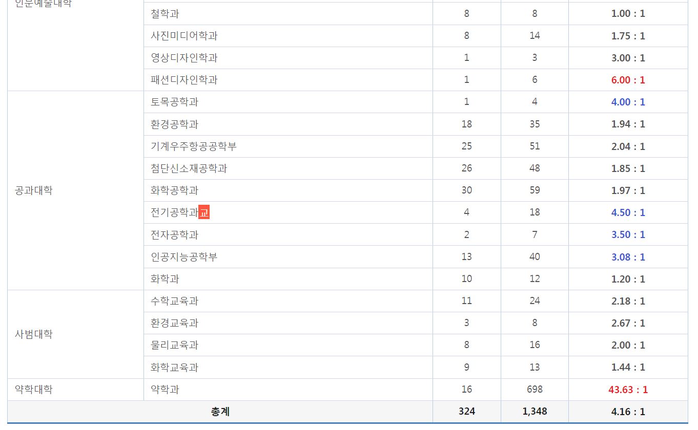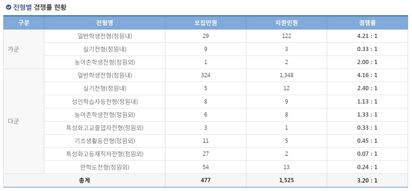 전형별 경쟁률을 먼저 보자면, 가군 실기전형(정원내), 다군 특성화고교졸업자전형(정원외), 다군 기초생활등전형(정원외), 다군 특성화고등재직자전형(정원외), 다군 만학도전형(정원외)는 미달이었으며, 이외의 전형 중 가장 경쟁률이 높았던 전형은 가군 일반학생전형(정원내)(4.21:1), 다군 일반학생전형(정원내)(4.16:1), 다군 실기전형(정원내)(2.40:1) 순이었습니다.