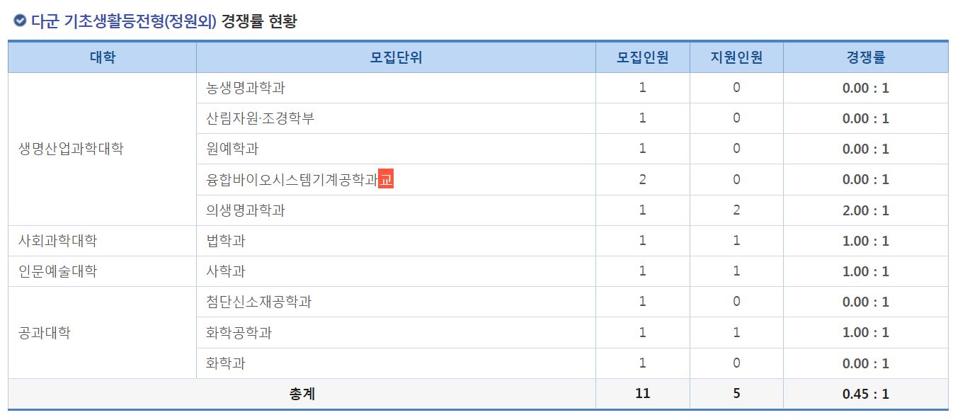 다군 기초생활등전형(정원외) 경쟁률 현황