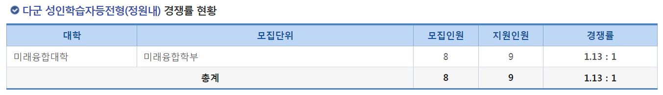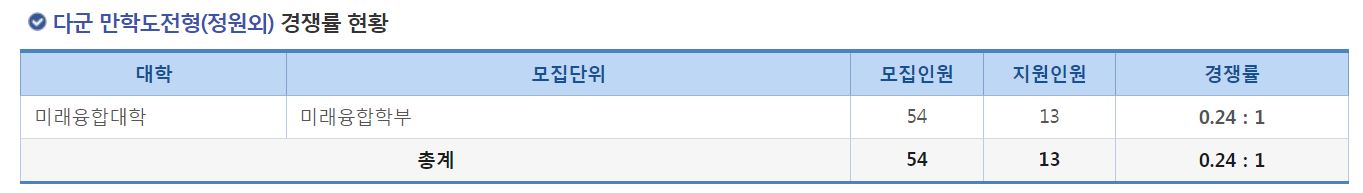 다군 만학도전형(정원외)에서는 미래융합학부의 신입생을 모집했으며, 미달이었습니다.