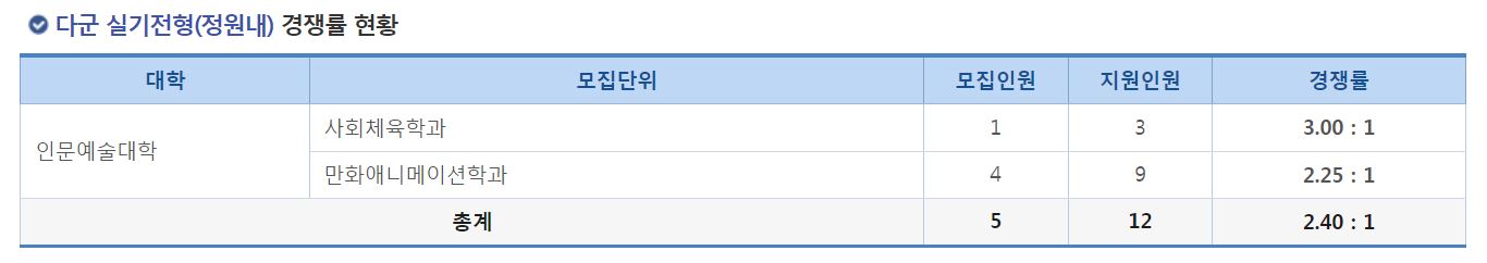 다군 실기전형(정원내)에서는 사회체육학과, 만화애니메이션학과의 신입생을 모집했으며, 사회체육학과(3.00:1), 만화애니메이션학과(2.25:1) 순이었습니다.
