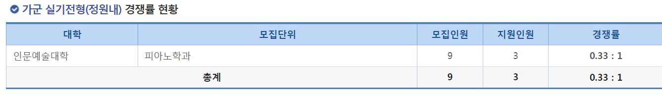 가군 실기전형(정원내)에서는 피아노학과의 신입생을 모집했으며, 미달이었습니다.