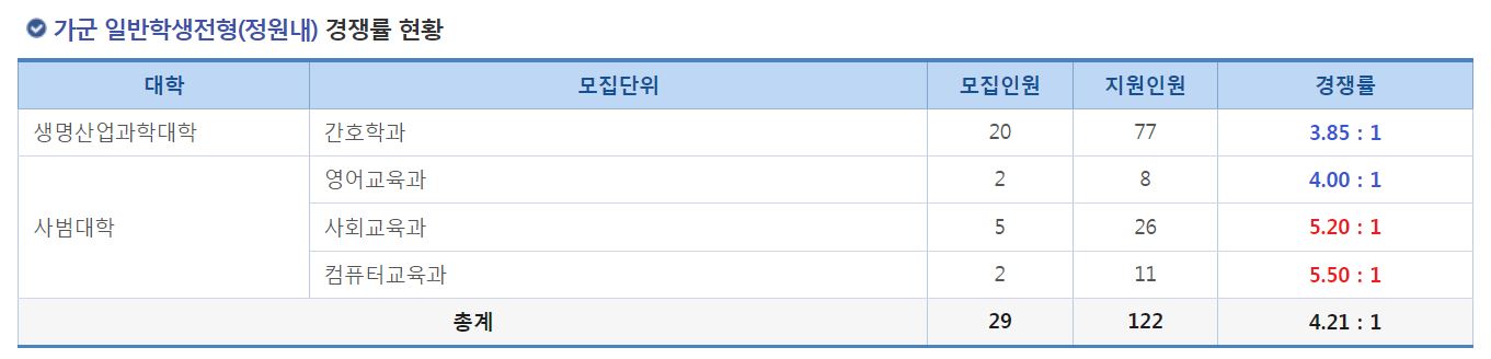 가군 일반학생전형(정원내) 에서 가장 경쟁률이 높았던 학과는 컴퓨터교육과(5.50:1), 사회교육과(5.20:1), 영어교육과(4.00:1) 순이었습니다.