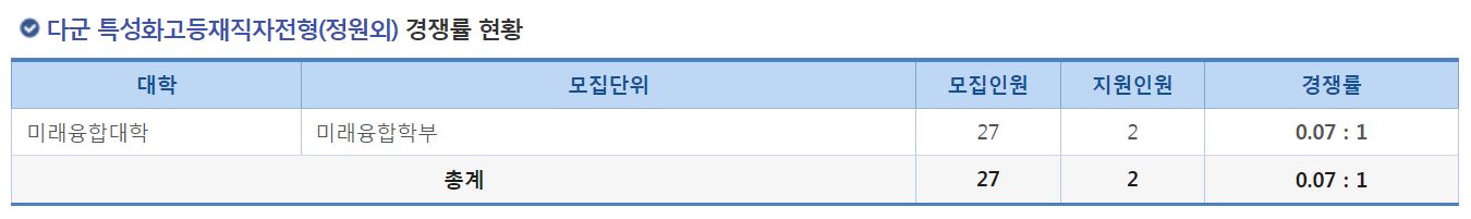다군 특성화고등재직자전형(정원외) 에서는 미래융합학부의 신입생을 모집했으며, 미달이었습니다.