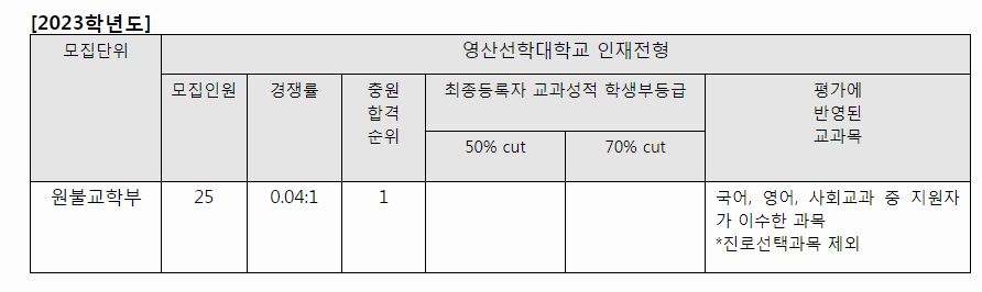 원래 3개년의 정시 등급을 올리지만, 영산선학대학교에서는 작년 정시 등급만을 공개하고 있기에 2023년 정시 등급에 대해서만 포스팅하도록 하겠습니다.