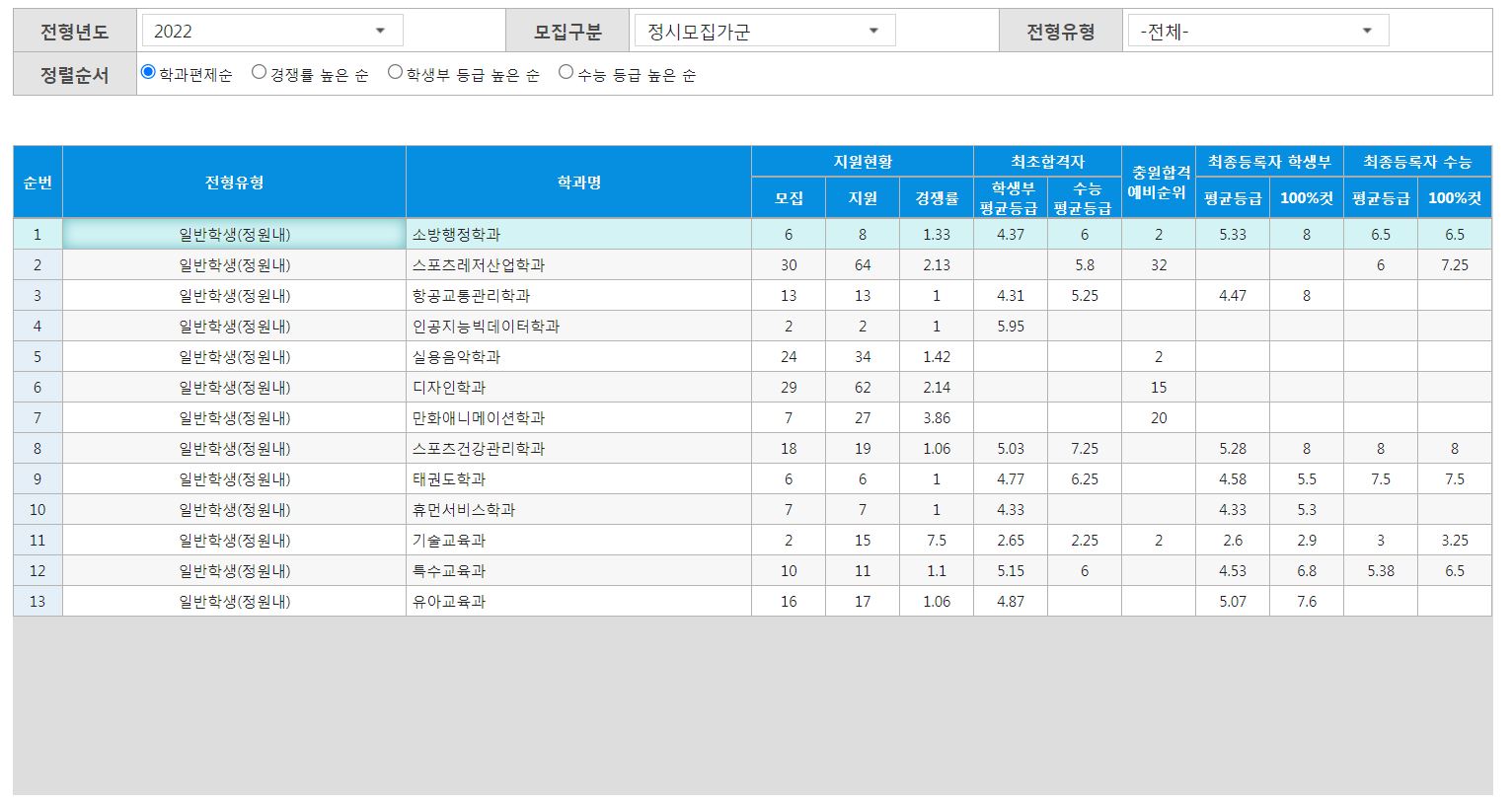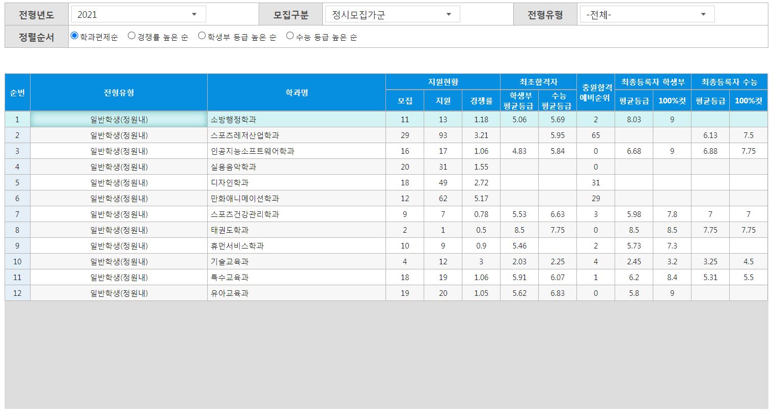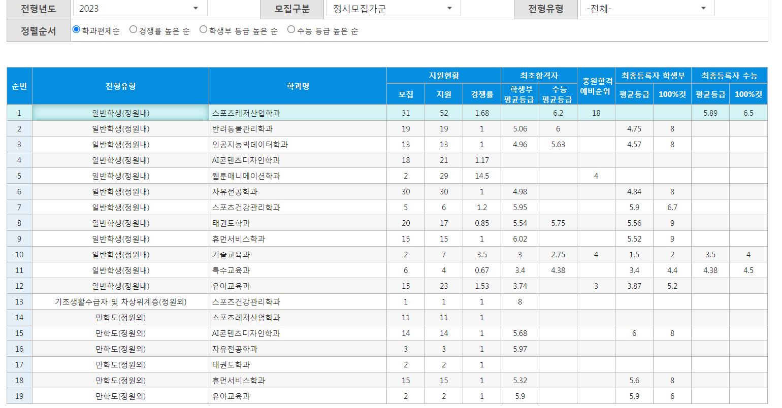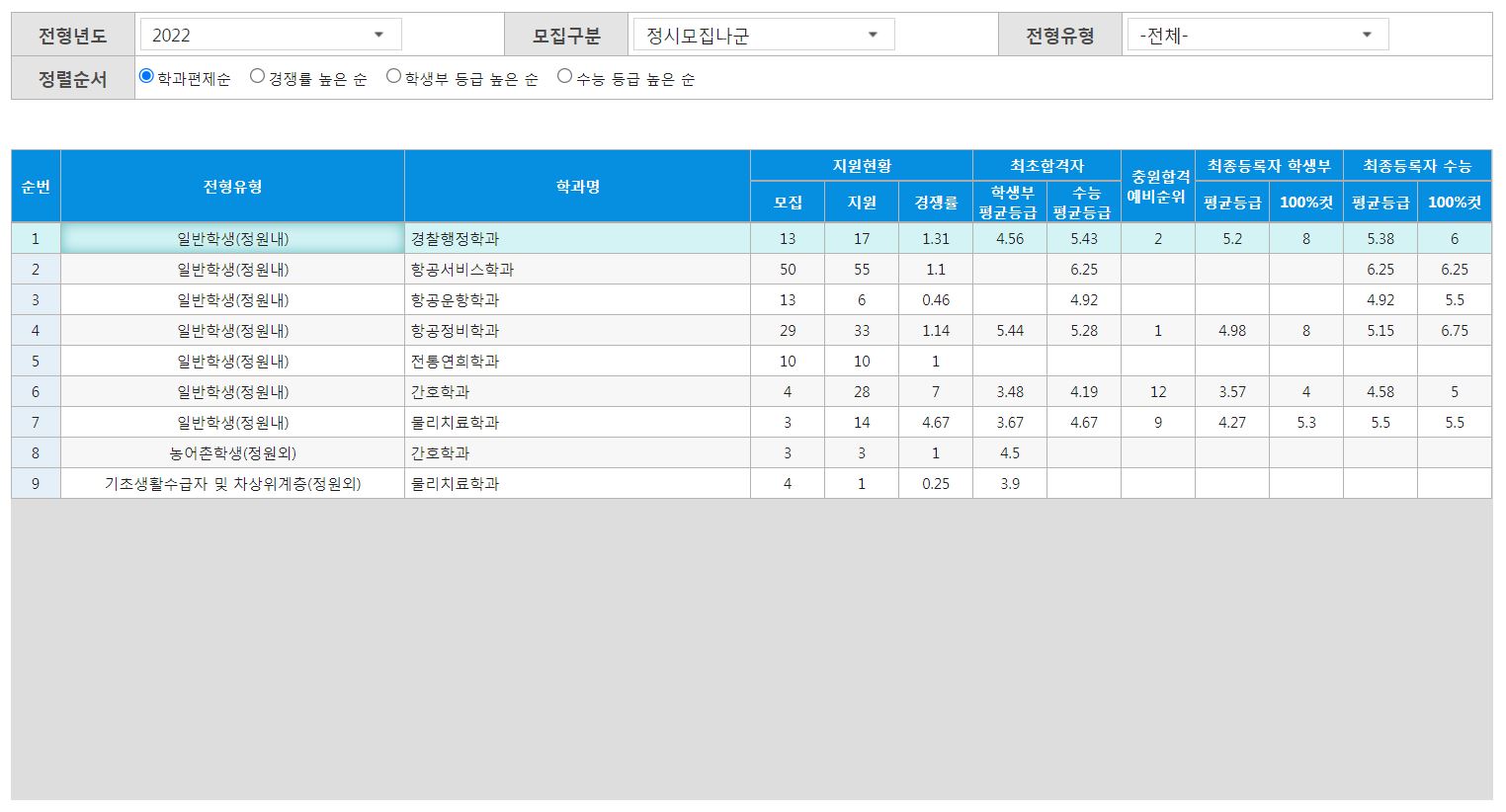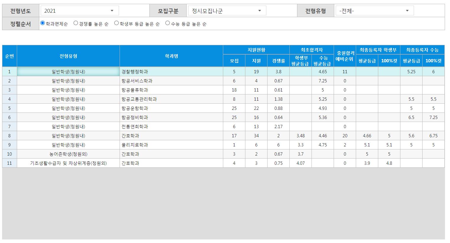 이 중 스포츠건강관리학과, 태권도학과, 휴먼서비스학과, 항공서비스학과, 항공물류학과, 항공운항학과, 항공정비학과, 간호학과(농어촌학생(정원외)), 간호학과(기초생활수급자 및 차상위계층(정원외))는 미달이었으며, 이외의 학과 중 제일 경쟁률이 높았던 학과는 만화애니메이션학과(5.17:1), 경찰행정학과(3.8:1), 스포츠레저산업학과(3.21:1) 순이었습니다.