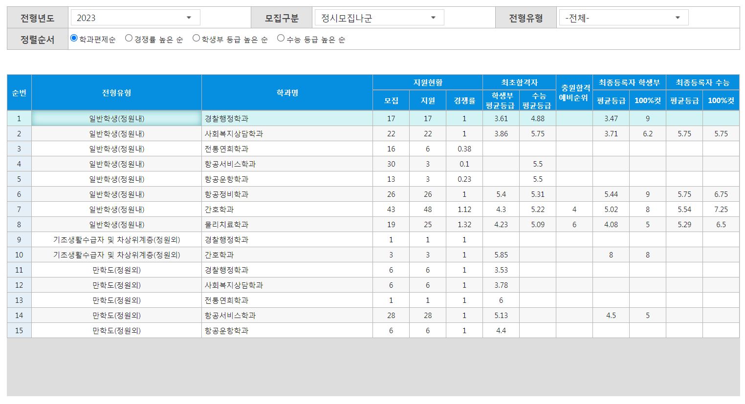 나군 : 경찰행정학과, 항공서비스학과, 항공운항학과, 항공정비학과, 전통연희학과, 간호학과, 물리치료학과