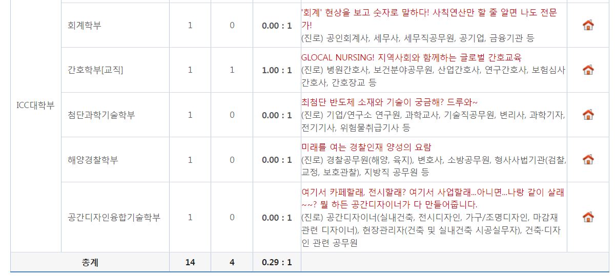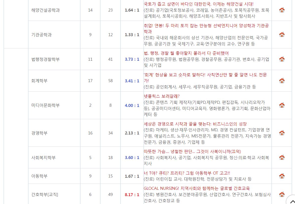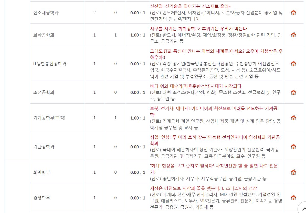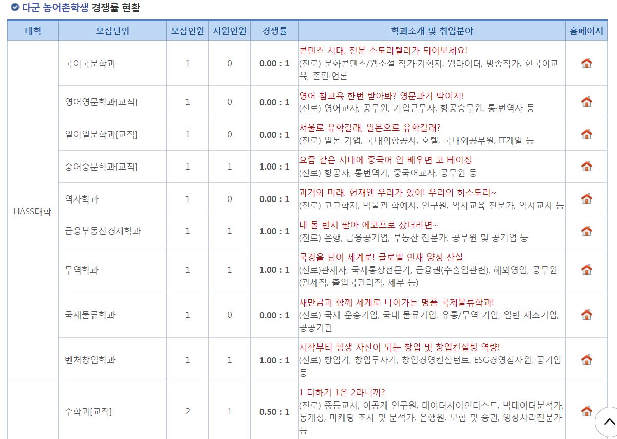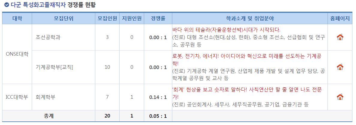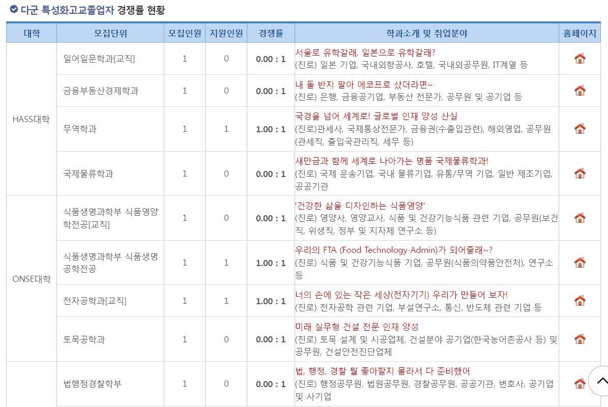 다군 특성화고교졸업자전형의 일어일문학과, 금융부동산경제학과, 국제물류학과, 식품생명과학부 식품영양학전공, 토목공학과, 법행정경찰학부, 회계학부, 첨단과학기술학부, 해양경찰학부, 공간디자인융합기술학부는 미달이었으며, 무역학과, 식품생명과학부 식품생명공학전공, 전자공학과, 간호학부는 모집인원과 지원인원이 같았습니다.