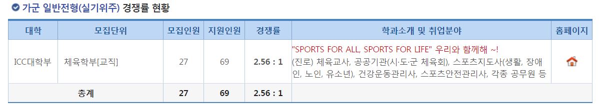 가군 일반전형(실기위주)에서는 체육학부를 모집했으며, 경쟁률은 2.56:1 이었습니다.