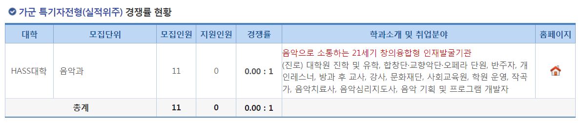 가군 특기자전형(실적위주)에서는 음악과를 모집했으며, 미달이었습니다.