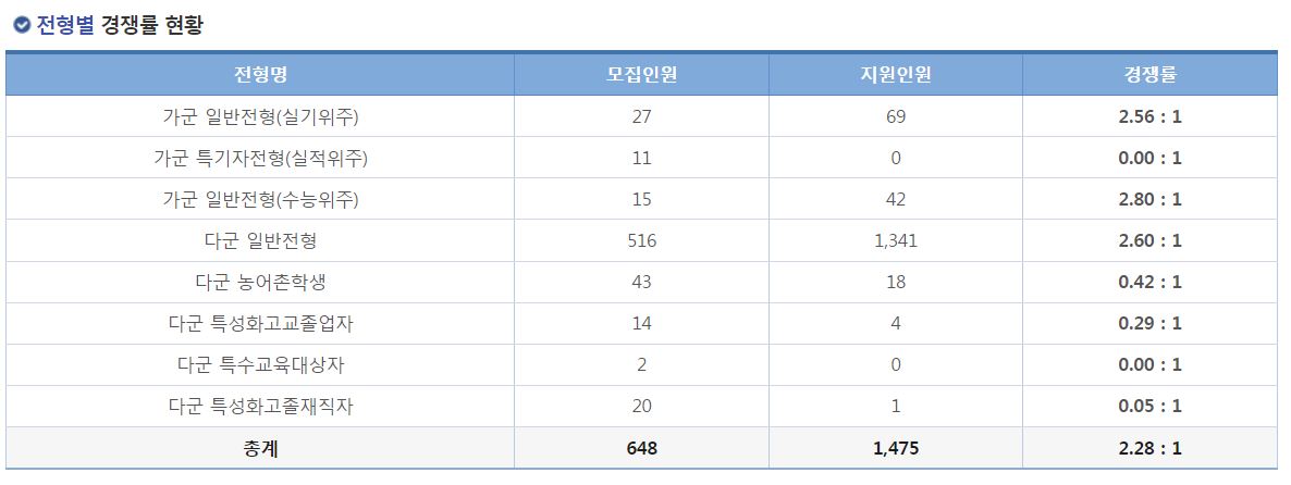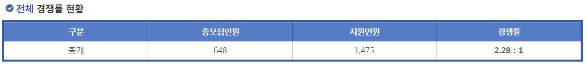 전체 경쟁률에 대해서 먼저 알아보도록 하겠습니다. 전체 경쟁률은 2.28:1 이었습니다.