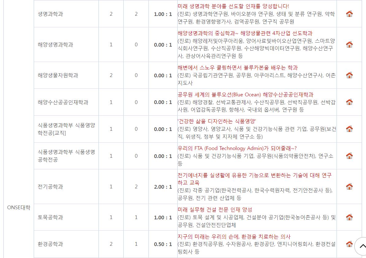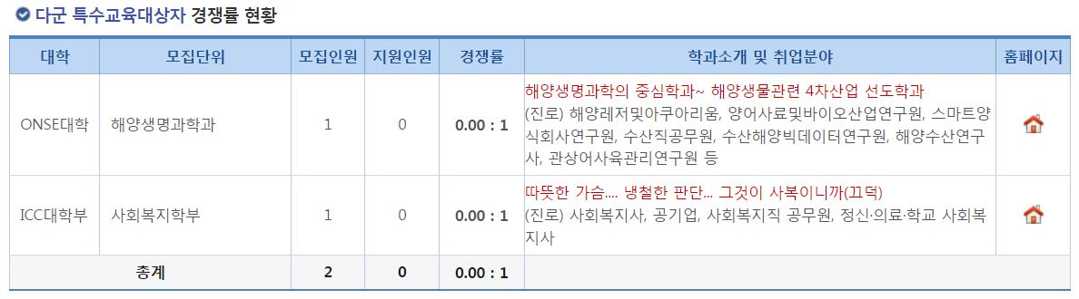 다군 특수교육대상자에서는 해양생명과학과, 사회복지학부의 신입생을 모집했으며, 모두 미달이었습니다.
