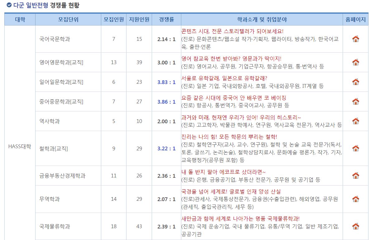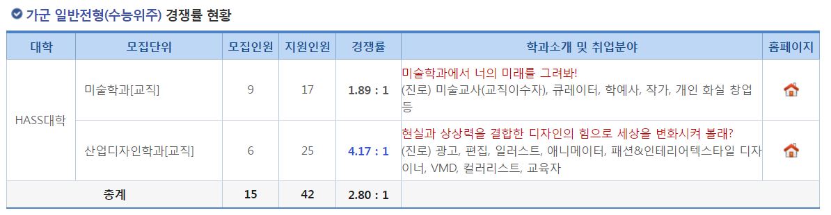 가군 일반전형(수능위주)에서는 미술학과, 산업디자인학과의 신입생을 모집했으며, 미술학과의 경쟁률은 1.89, 산업디자인학과의 경쟁률은 4.17:1 이었습니다.
