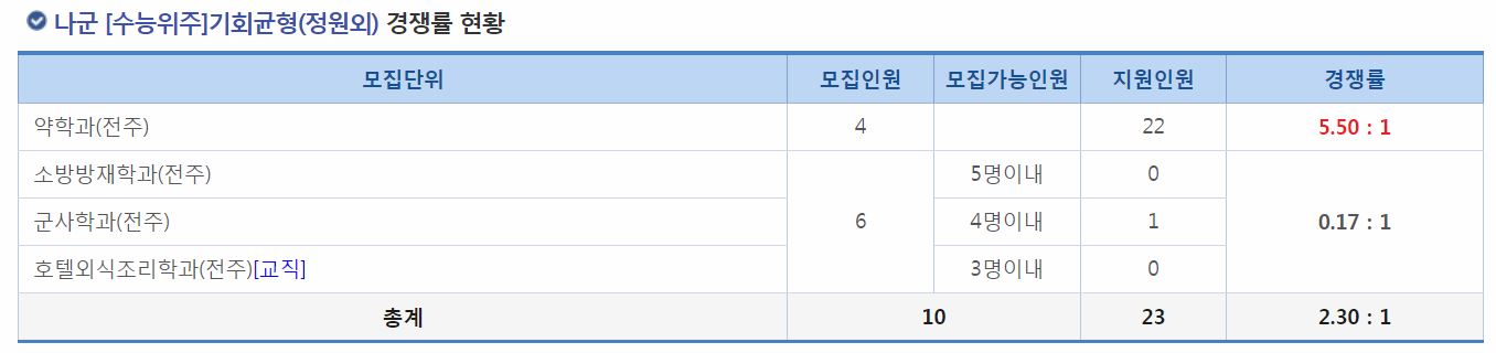 나군 [수능위주]기회균형(정원외) 전형에서는 약학과(전주)를 따로 모집했으며, 소방방재학과(전주), 군사학과(전주), 호텔외식조리학과(전주)를 통합하여 학생을 모집했습니다. 통합모집의 경우 미달이었으며, 약학과(전주)의 경쟁률은 5.50:1 이었습니다.