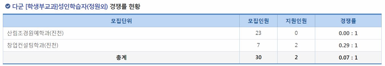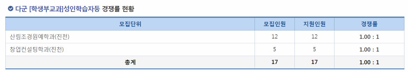 다군 [학생부교과]성인학습자등 전형에서는 산림조경원예학과(진천), 창업컨설팅학과(진천)의 모집인원과 지원인원이 같았습니다.