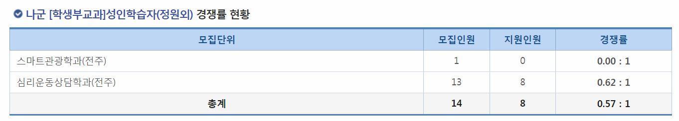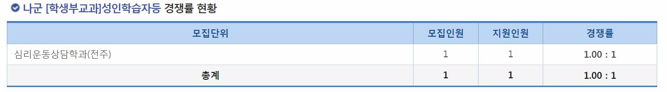 나군 [학생부교과] 성인학습자등 전형에서는 심리운동상담학과(전주)의 신입생을 모집했으며, 모집인원과 지원인원이 같았습니다.